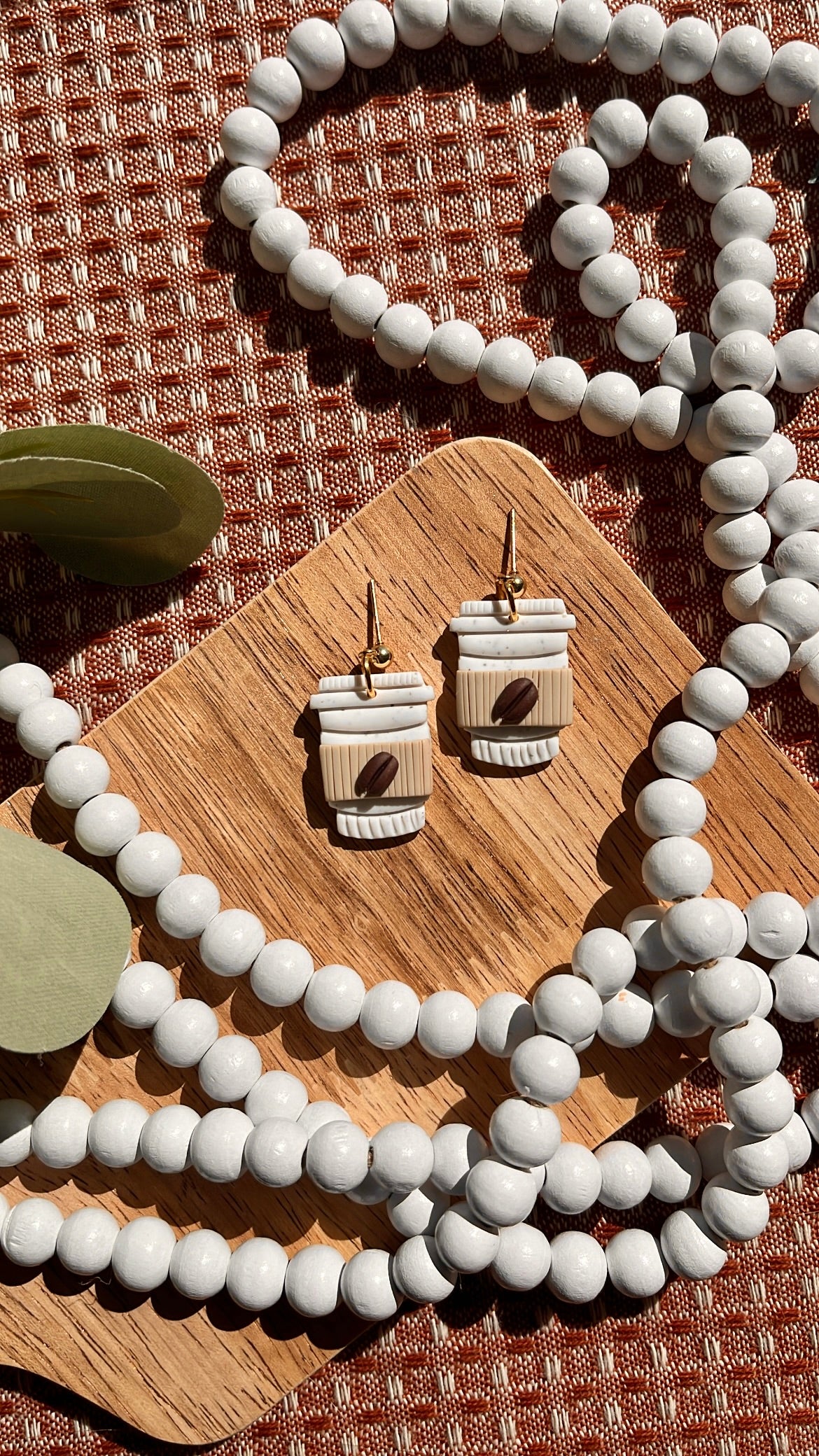 Speckled white coffee cups with a beige coffer cover and cute mini coffee bean!☕️🤎