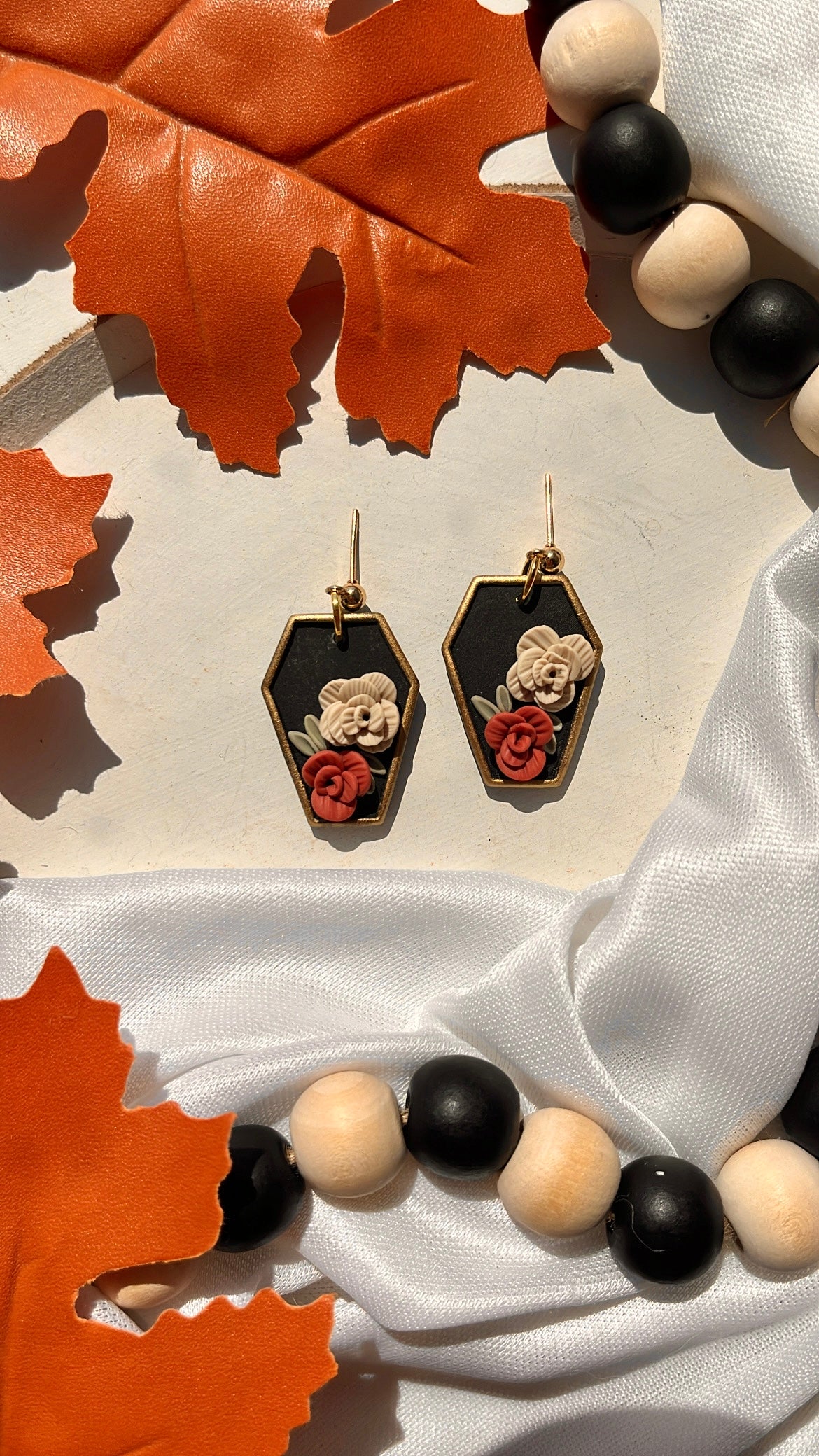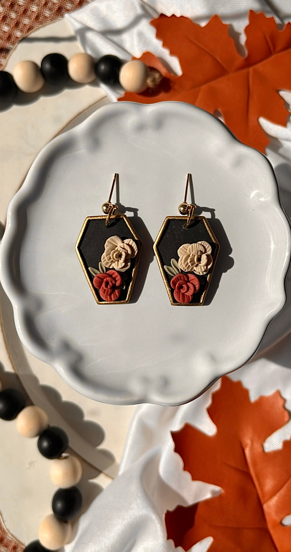 Black Coffin frames with dark pink and beige detailed flowers + gold border ✨⚰️🖤🌸